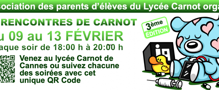 Les Rencontres de Carnot s’adressent aux parents, élèves, enseignants, professionnels de santé et acteurs institutionnels. Durant la semaine du 09 au 13 février, chaque soirée, de 18h à 20h, sera l’occasion d’échanger avec des experts, de poser des questions et de partager des expériences. Les débats seront également accessibles en visioconférence et un QR code unique permettra de suivre l’intégralité de l’événement à distance.